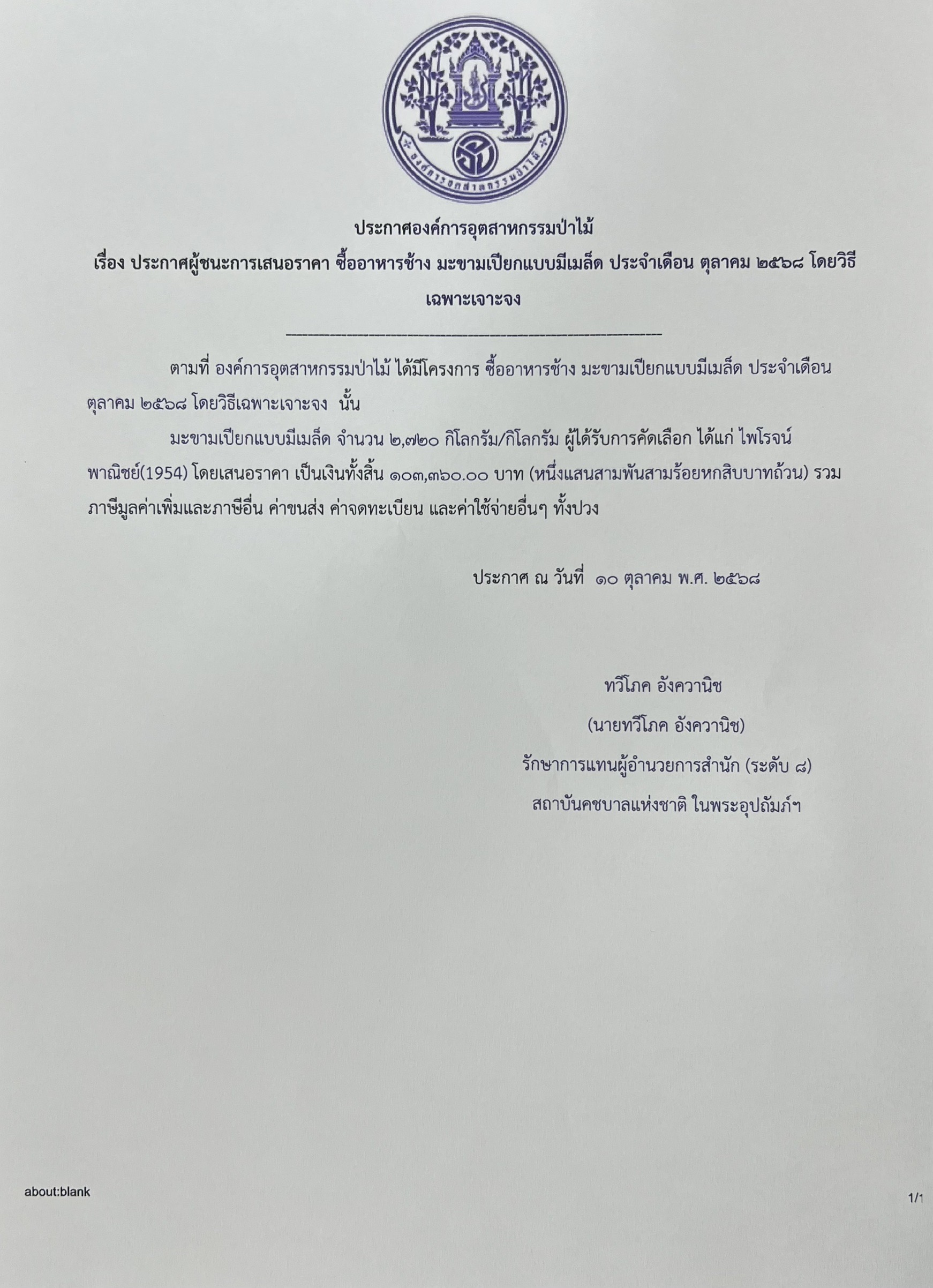 ประกาศผู้ชนะการเสนอราคา ซื้ออาหารช้าง ประจำเดือนตุลาคม 2568
